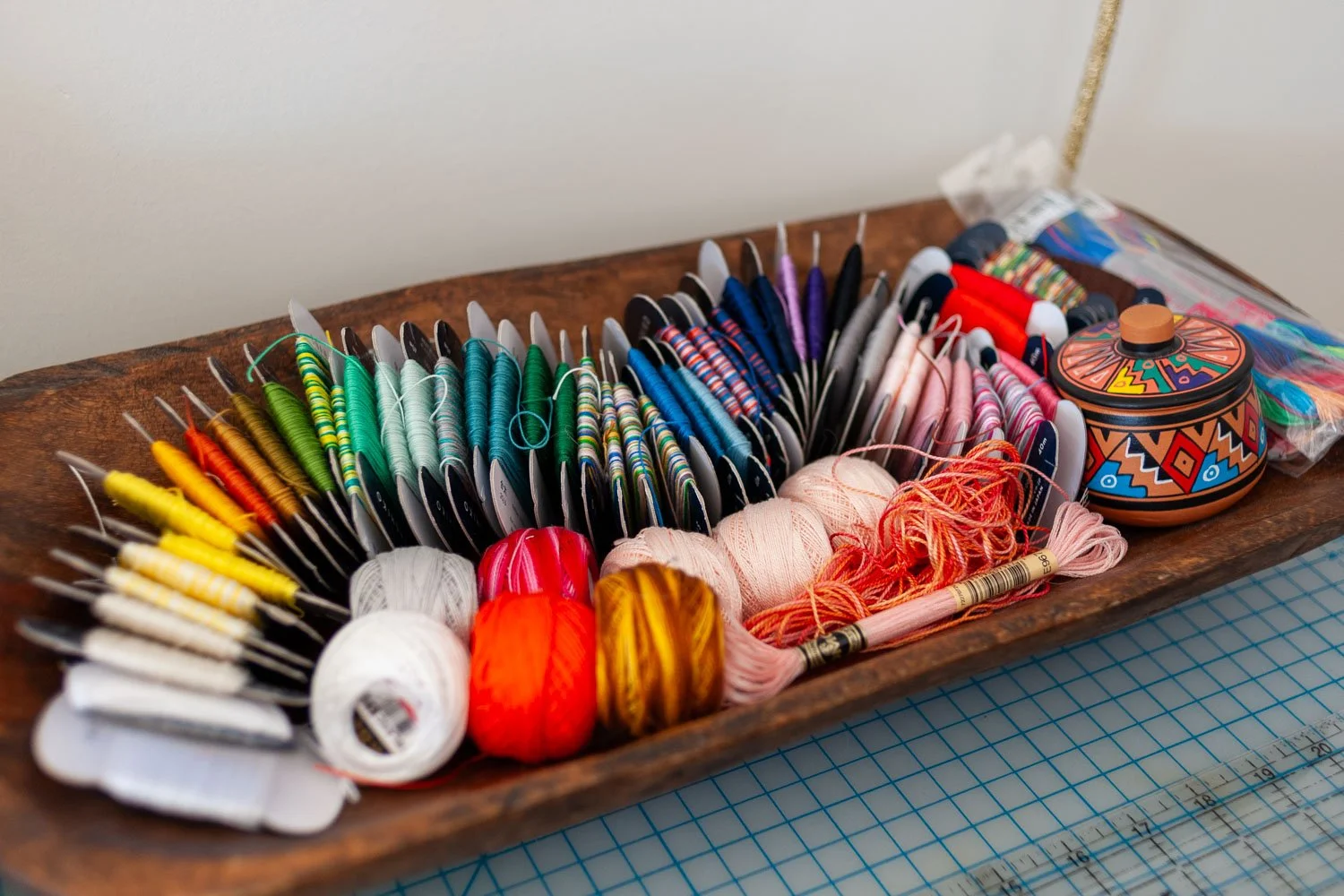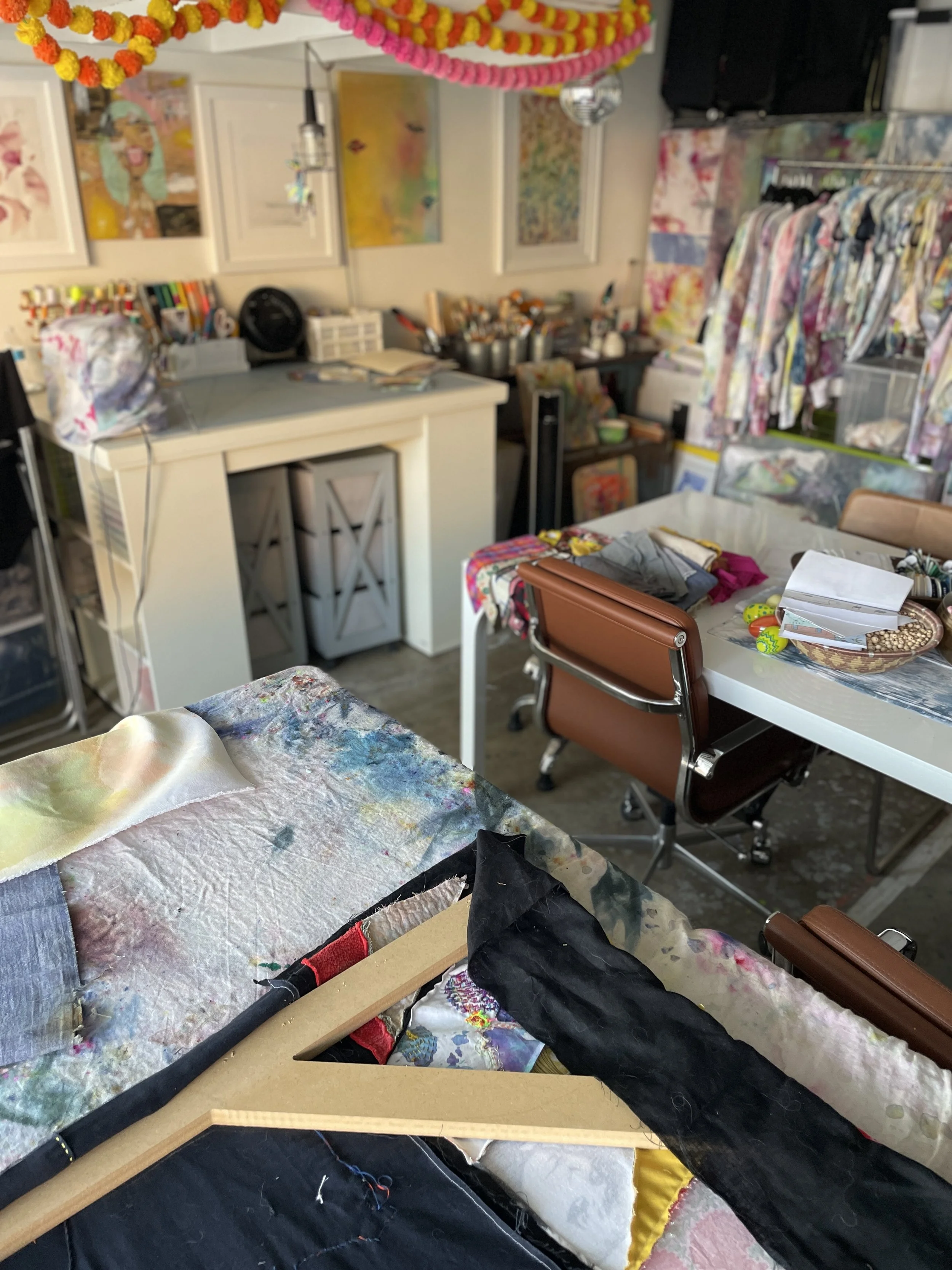 Working in the studio, with a wide range of projects and processes concurrently taking place, gets crowded quickly. I’m constantly on projects that vacillate between: dyeing, marbling, quilting/sewing, screen printing, drawing/painting and beading— and I need love having dedicated space for each.