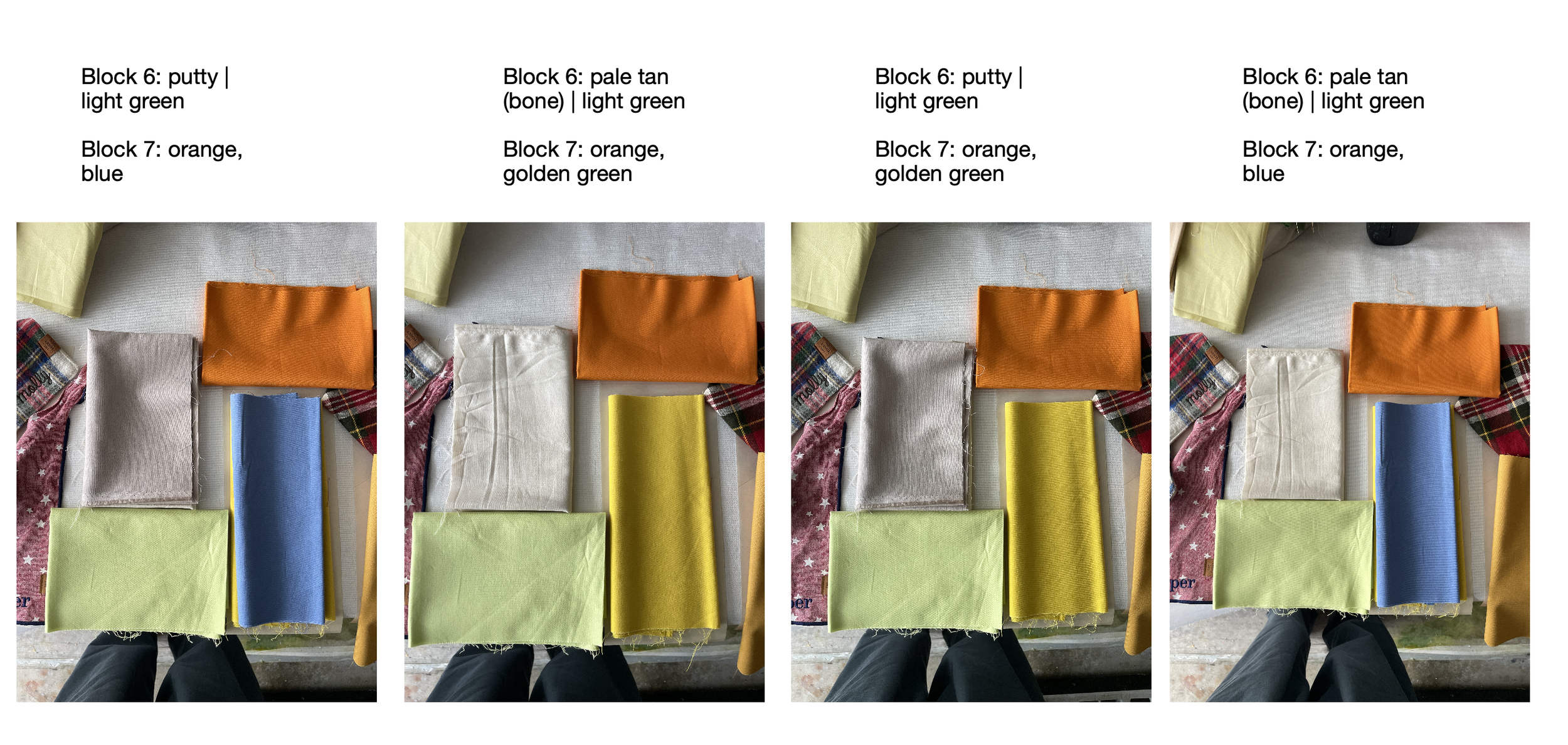With the hero bandanas in hand, and a couple hundred shades of solid cotton at the ready, I arranged fabrics atop paper templates (cut to scale) and documented my favorites.